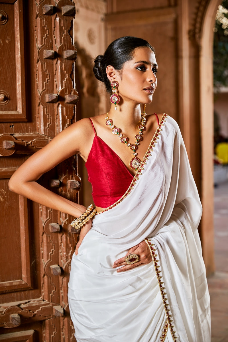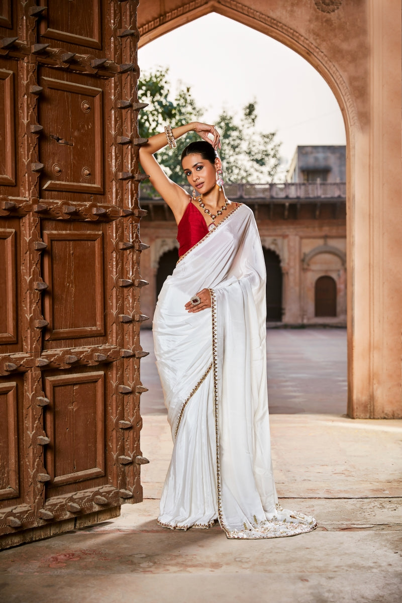 This milky white saree projects a sense of chastity and is decorated with sequin, nakshi and zardozi. It is paired with a graceful contrast blouse.