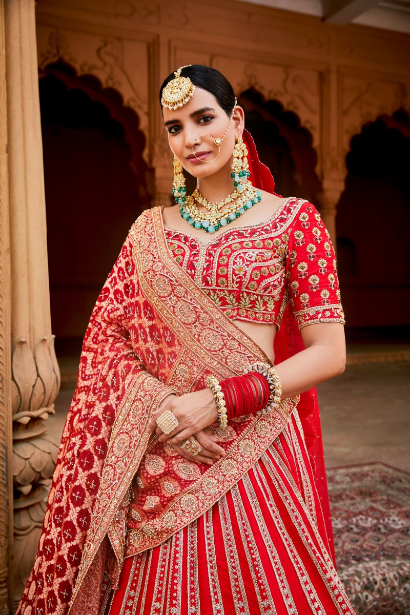 An expression of dignified heritage era, this classical red lehenga set is beautifully handcrafted with dabka, marodi, nakshi and zardozi. The motifs on the lehenga shows birds pleasantly relaxing with immense freedom around blooming herbs. It is paired with a sumptuous handcrafted bandhani side dupatta styled with an ornate embroidered veil.