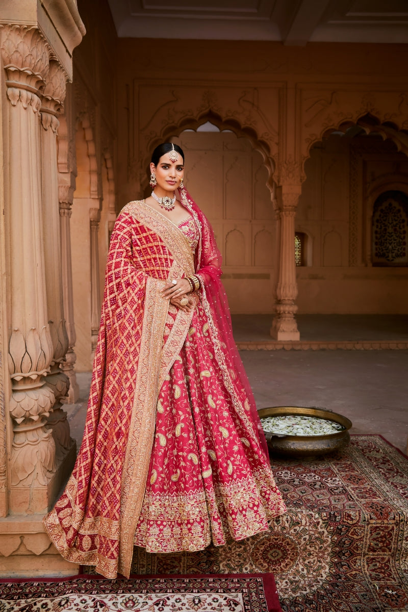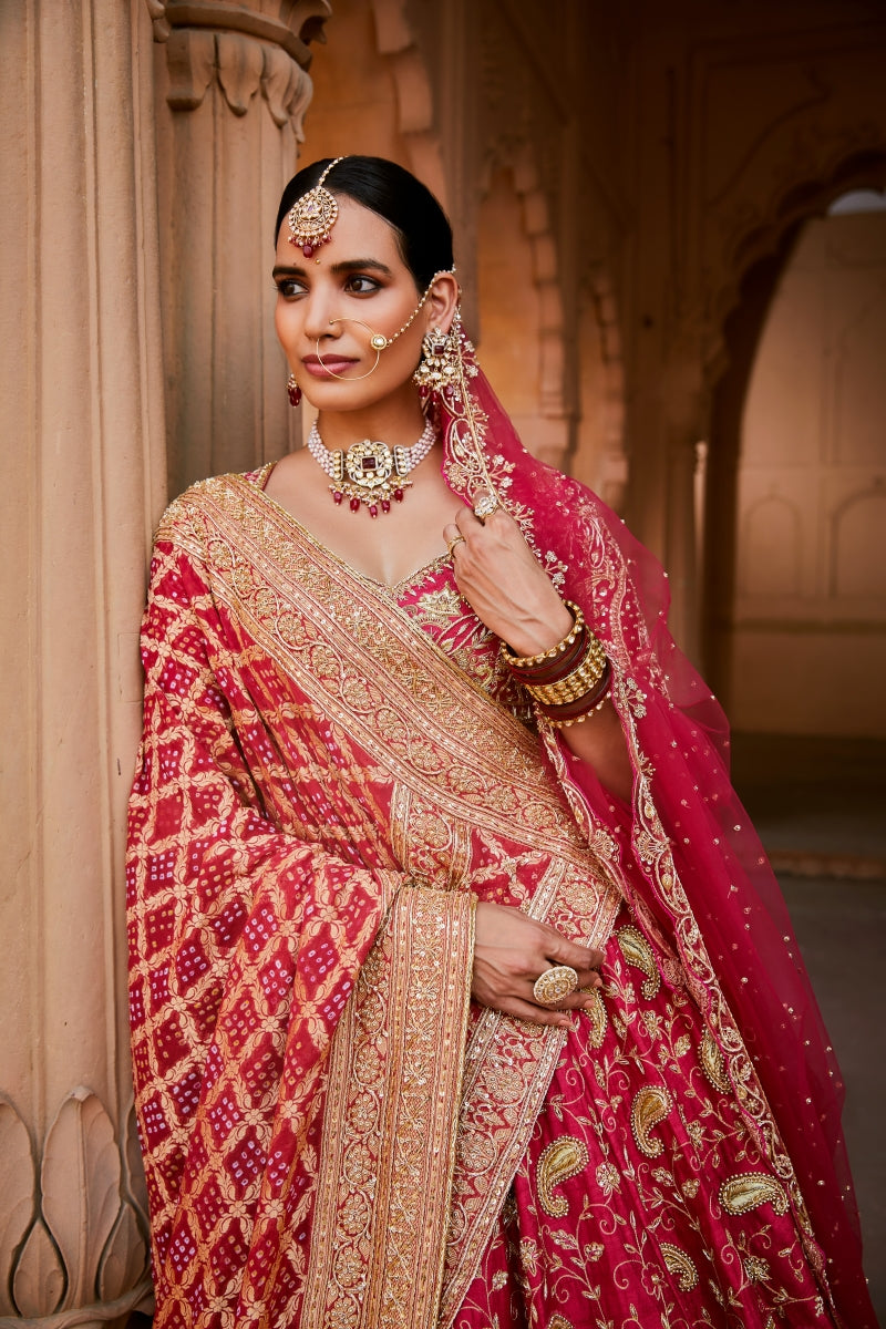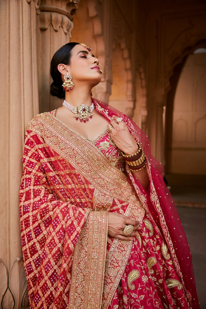 Crafted with care, this outfit is excessively embroidered with zardozi, dabka, marodi, and kasab. The motifs are derived from Persian droplets symbolizing eternity and life; layered with ancient caravanserai-like structure at the lehenga hemline. This outfit is beautifully coordinated with a bandhani handloom dupatta and stylized with a heavily embellished tulle dupatta.