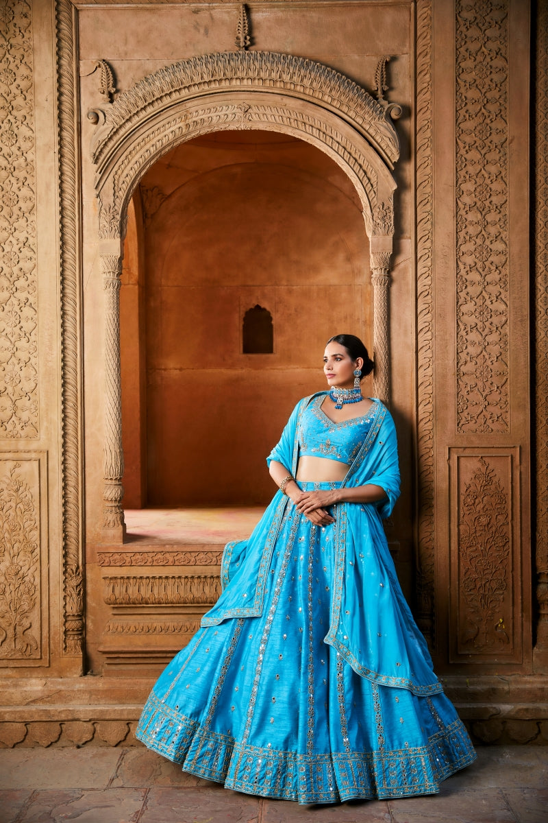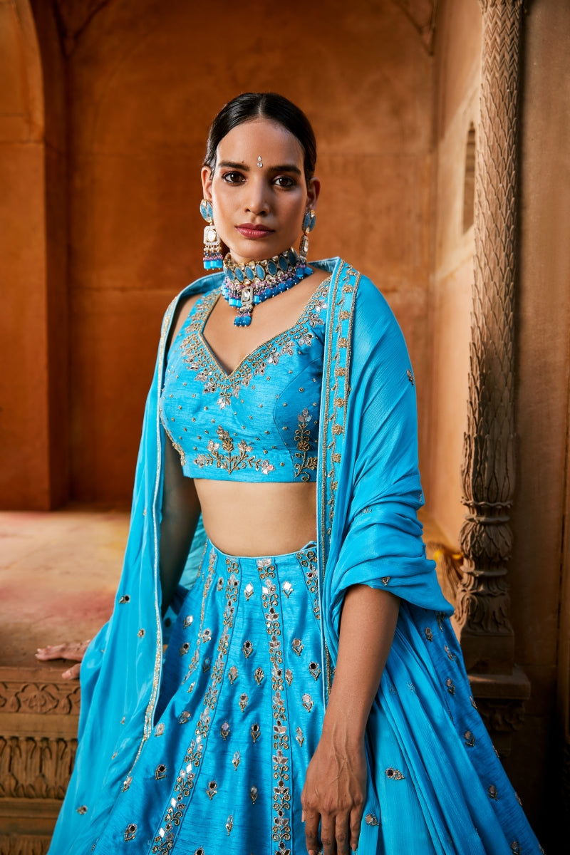 Shine brighter with our exquisite mirror lehenga embellished with glass beads and mirror all over. It is paired with a delicately embroidered blouse with floral motif and dupatta handcrafted on the borders.